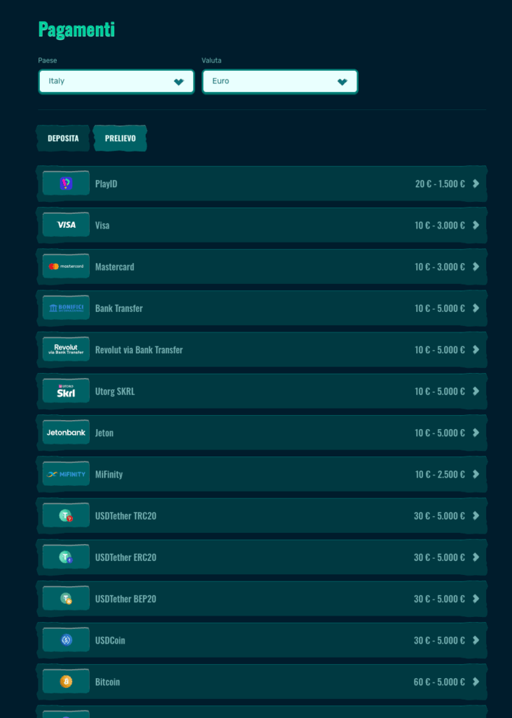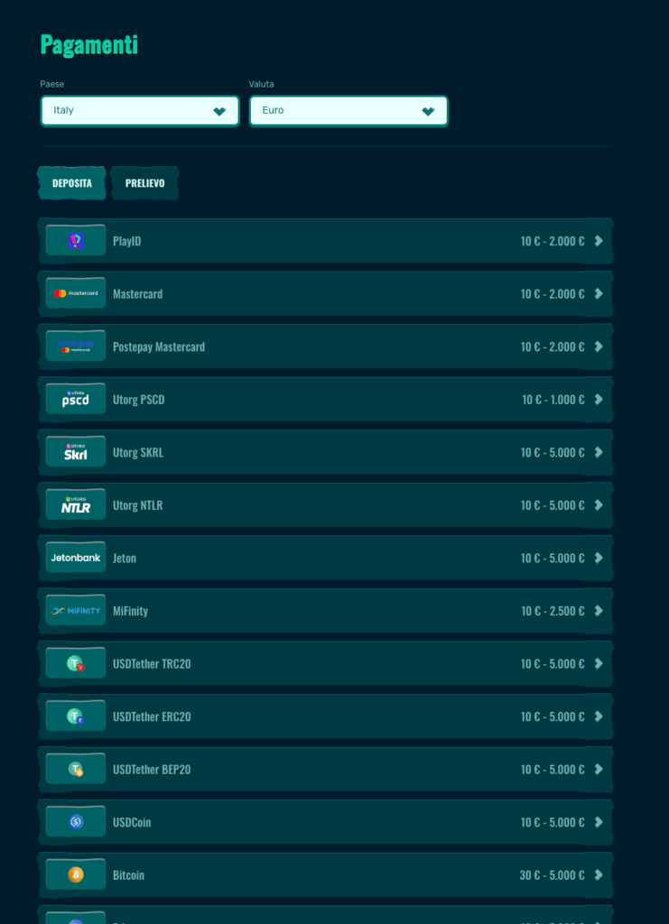 Bonifico Bancario: Per chi preferisce i metodi tradizionali o desidera depositare importi maggiori, il bonifico bancario è disponibile. Sebbene non sia istantaneo come altri metodi (può richiedere 1-3 giorni lavorativi), non ha limiti massimi di deposito, rendendolo ideale per gli high roller.